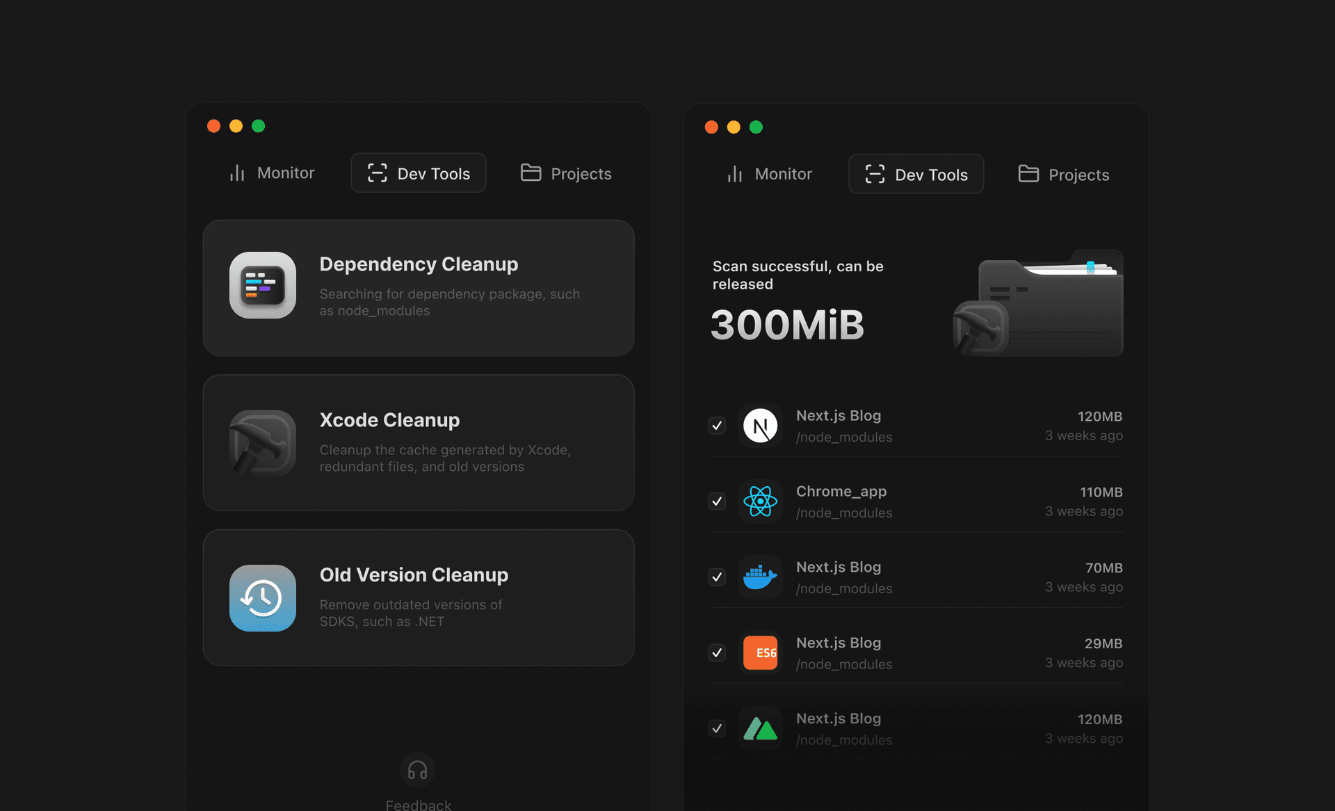 Unlike traditional file cleaners, EasyDevo focuses on tidying up your development space, including project dependencies, SDKs, and some old files on Xcode. We're committed to constantly refining this process, freeing up storage to rejuvenate your development experience.
