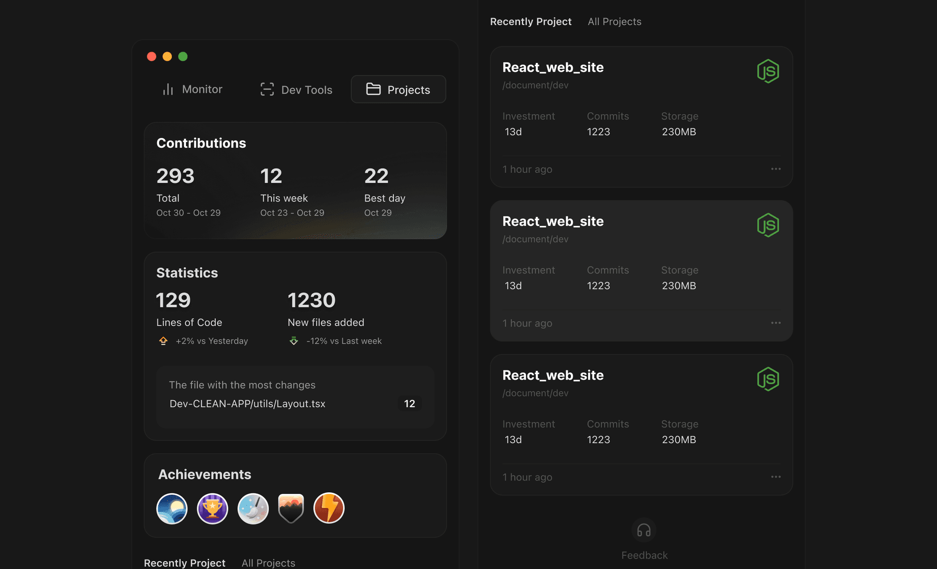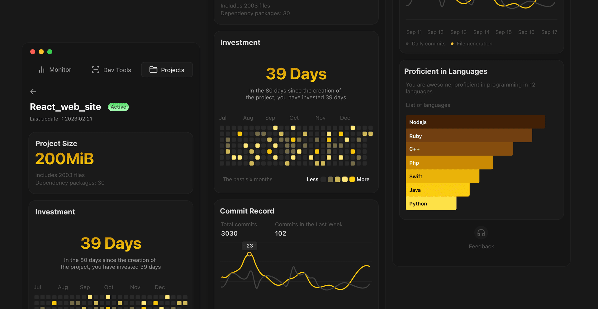 Furthermore, our project analysis allows you to view the time invested, storage usage, and language analysis for each local project. It also displays recent updates and the active status of projects.