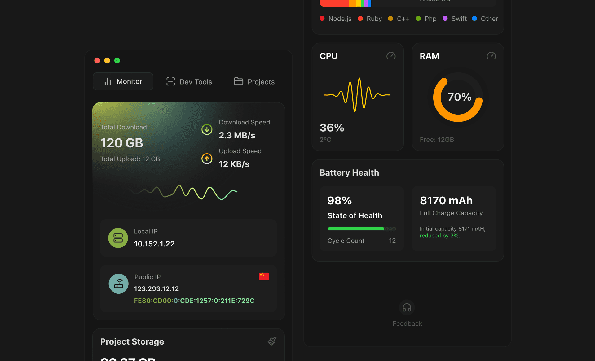 - Network: Monitors total download/upload, real-time speed, displays Local/Public IP, and Proxy IP (if enabled).