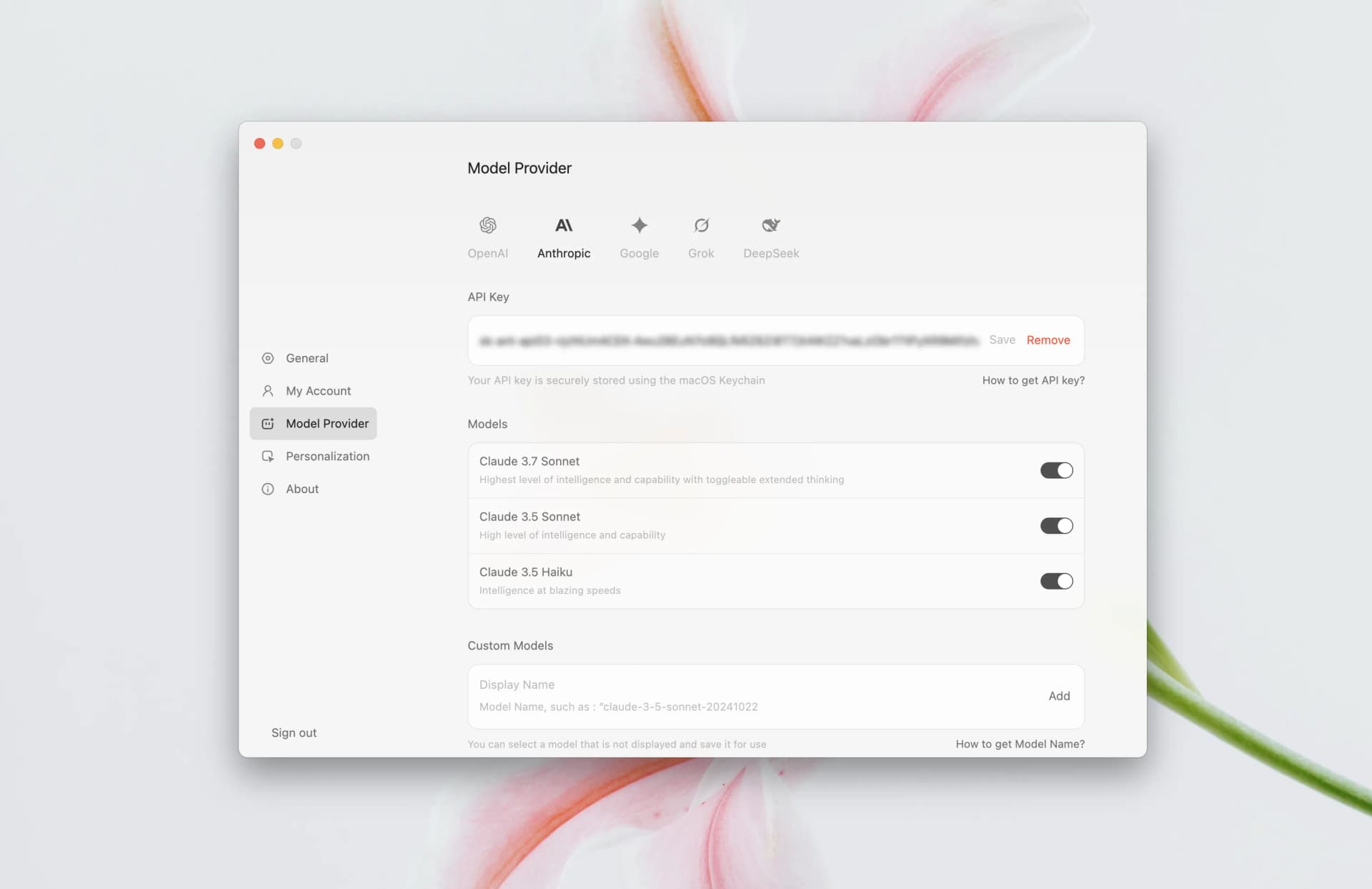 We’ve pre-configured several popular providers for you, including OpenAI, Claude, Gemini, DeepSeek, and Grok. In the future, we’ll also introduce more options like GitHub and OpenRouter. In addition to the latest models we provide, you can freely add your own custom models and start using them in conversations.