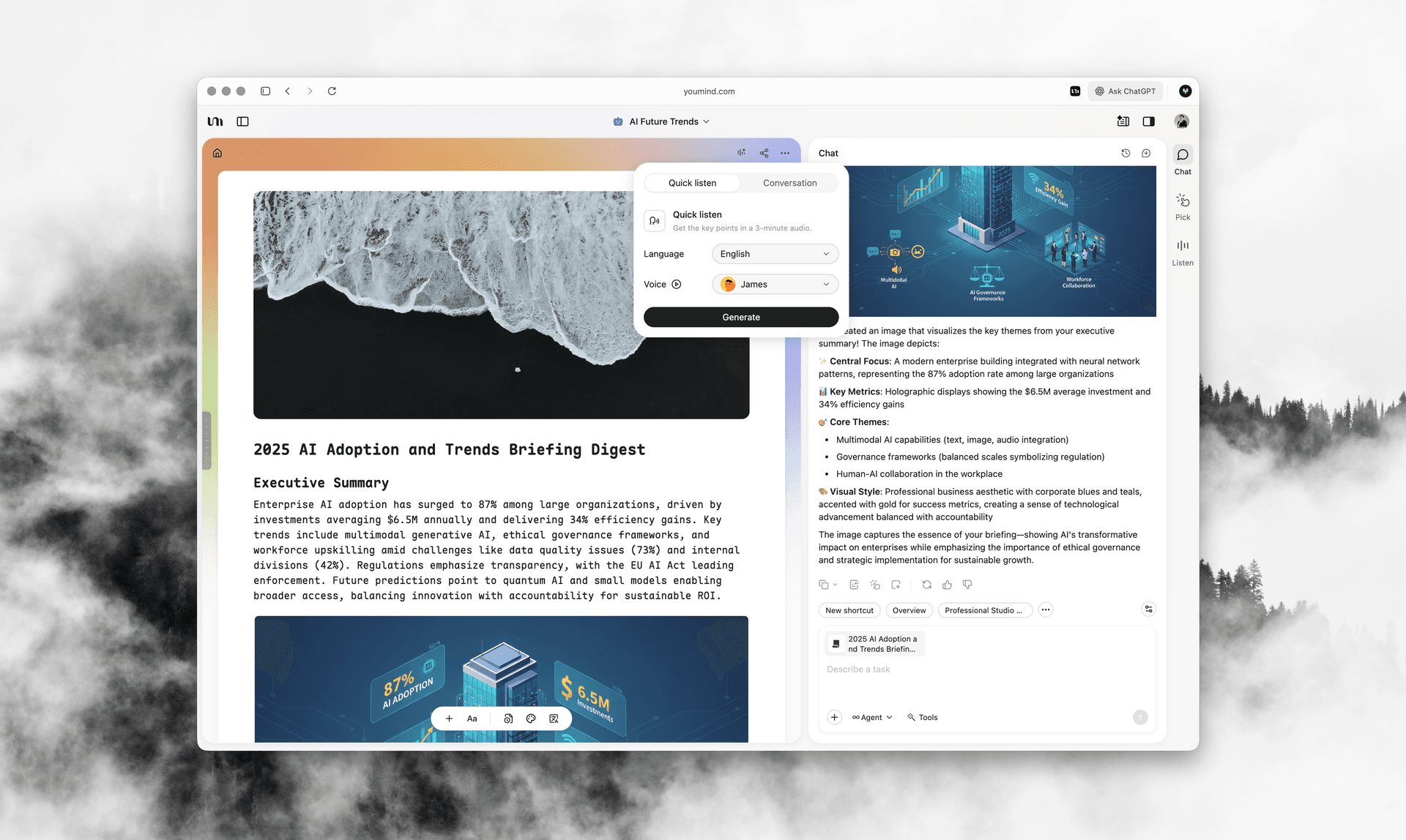 When words are not enough, YouMind can also turn the same content into audio. Listen on your commute or during a walk. Let the thinking happen when it wants to, then come back and make the edits that matter.