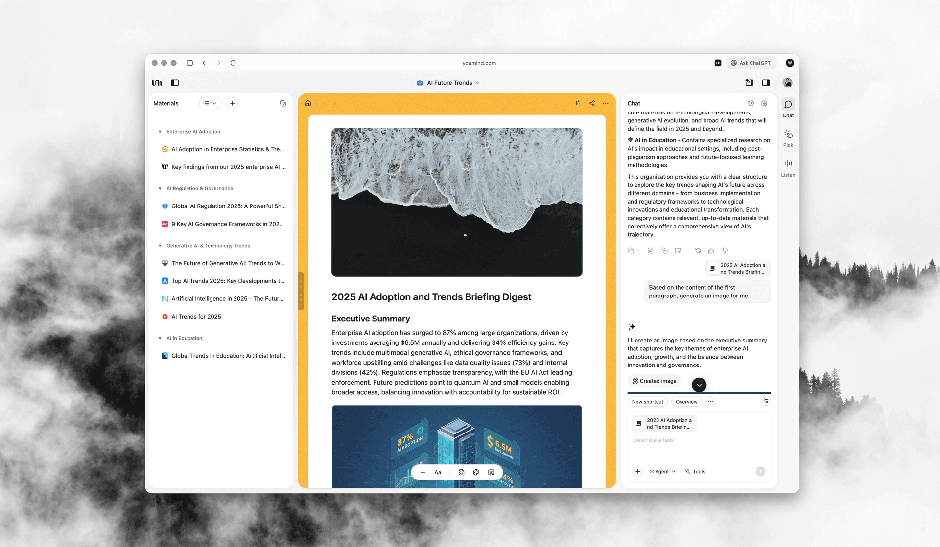 If generation once felt like a one‑off spark, this time it stays connected. From the first second, what YouMind creates with you is fully editable. Any sentence can be rewritten, split, or moved. When a topic is fully developed, you can carry those takeaways into the next one and keep building.