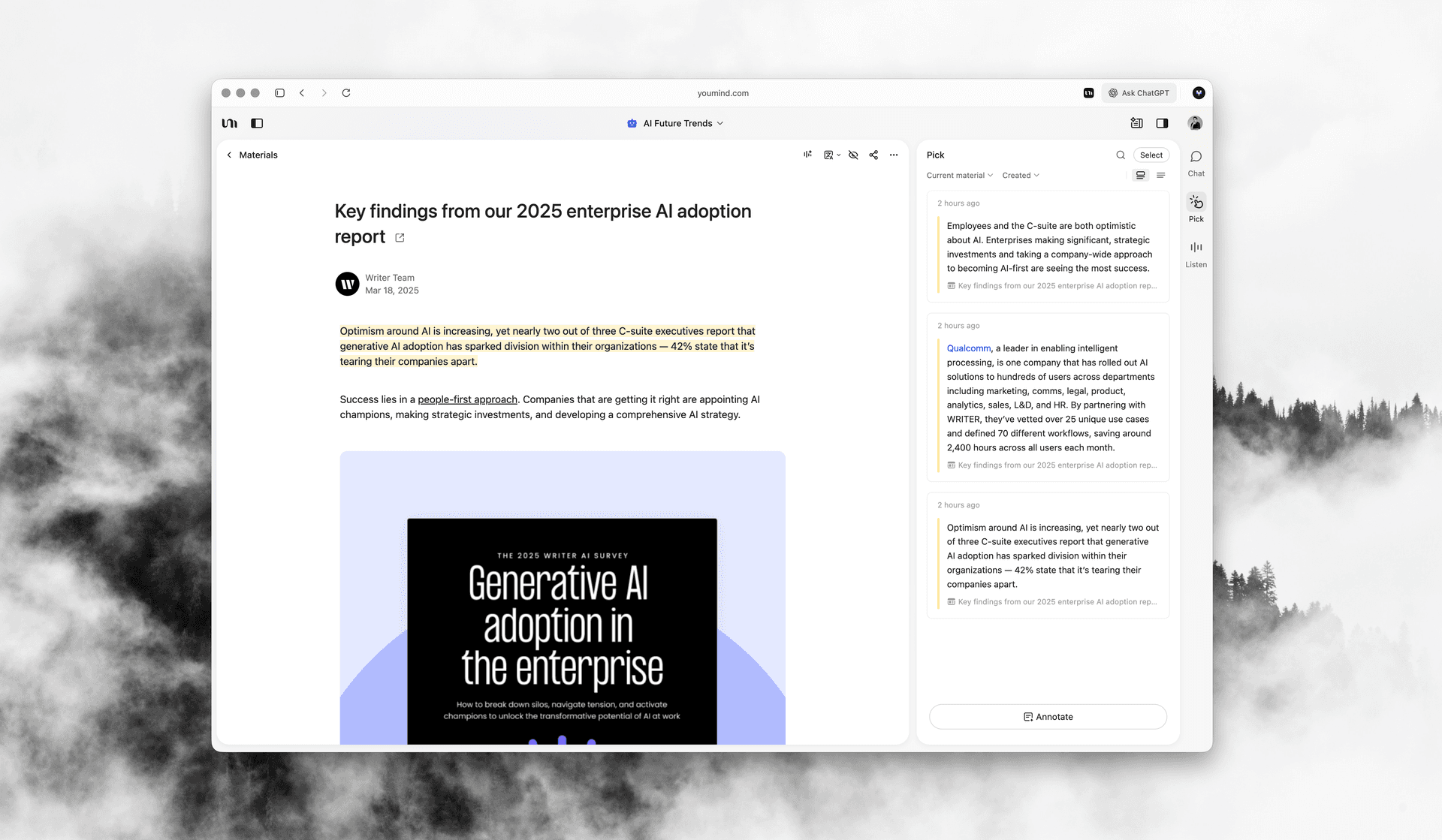 Once you know where to start, the real change happens on the Board. Materials, ideas, and outputs flow in one place, so you are not bouncing between tools. The clips you saved from the web, the moments you marked in a YouTube video, and your PDF highlights all come back to the materials area and can act as live context while you write.