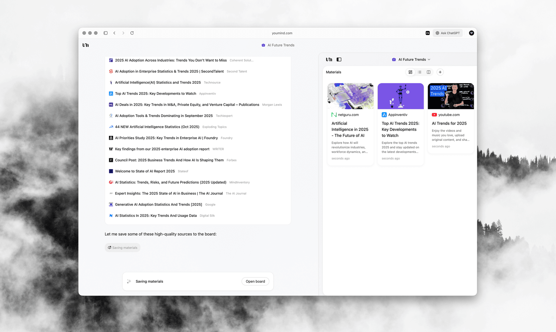 YouMind mirrors how real research unfolds. Enter a topic and the process is laid out step by step: scope the question, find sources, read with focus, organize the takeaways, and produce a summary you can edit. Ask a follow‑up and it fills the gap. If you need more material along the way, ask in the chat and the results return to your Board so they live with everything else you have gathered.